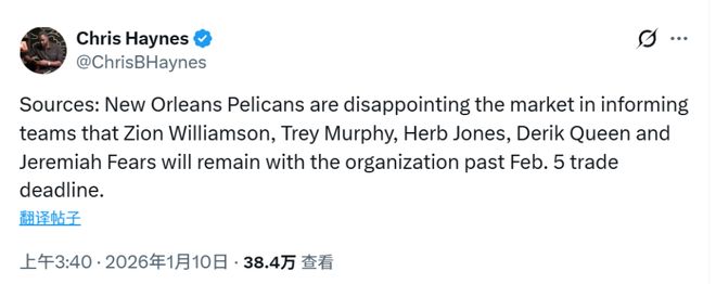 北京时间1月10日,据NBA名记Haynes报道,新奥尔良鹈鹕队已向联盟其他球队明确表示,在2月6日交易截止日(北京时间)前,无意交易锡安-威廉姆森、特雷-墨菲、赫伯特-琼斯、德里克-奎因和耶利米-费尔斯。