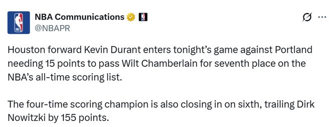 北京时间1月10日,NBA巨星凯文·杜兰特即将迎来职业生涯又一里程碑。只需在接下来的比赛中再得15分,他就将超越威尔特-张伯伦,升至NBA历史得分榜第七位。NBA官方已提前发布相关预热内容,引发球迷关注。