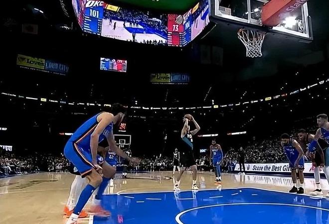 之后看雷霆队的亚历山大直接强突卡马拉,成功造成对手犯规,稳稳命中罚球。