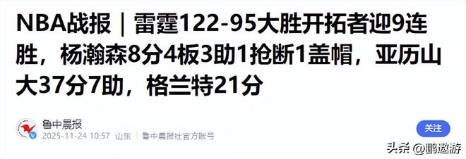 鲁中晨报(NBA战报|雷霆122-95大胜开拓者迎9连胜,杨瀚森8分4板3助1抢断1盖帽,亚历山大37分7助,格兰特21分2025.11.24)