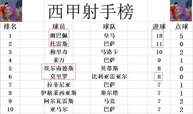 射手榜方面,姆巴佩18球继续领跑,托雷斯11球位列第二,穆里奇10球排名第三,莱万9球位列第四。莫里罗本场比赛贡献传射两球,与埃尔南德斯并列第5,均为8球。拉菲尼亚、亚马尔和阿尔瓦雷斯各7球,挤入前十。