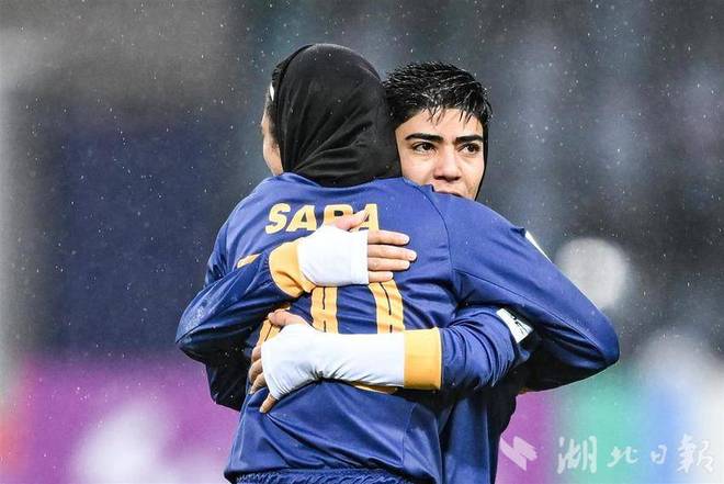 11月17日下午,巴姆卡通女足(伊朗)队员哈穆迪罚进点球后与队友拥抱庆祝。(湖北日报全媒记者任勇摄)